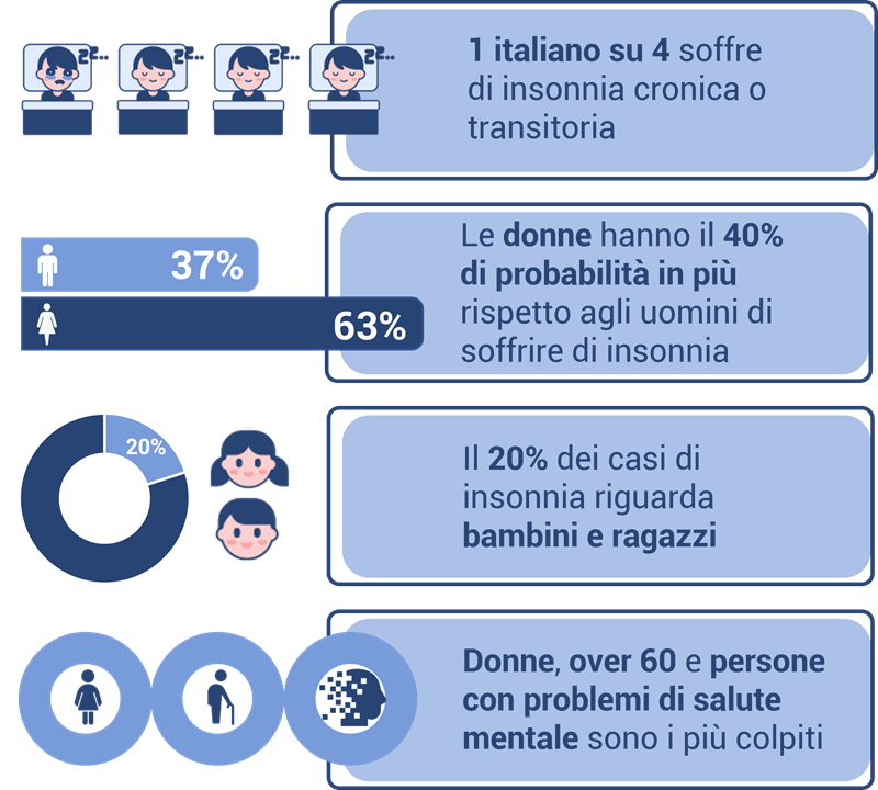 I disturbi del sonno sono estremamente diffusi nella società moderna e colpiscono circa 12 milioni di italiani. Il più diffuso è l’insonnia che, in forma più o meno grave, colpisce circa il 41% della popolazione, con un aggravarsi della problematica all’avanzare dell’età.